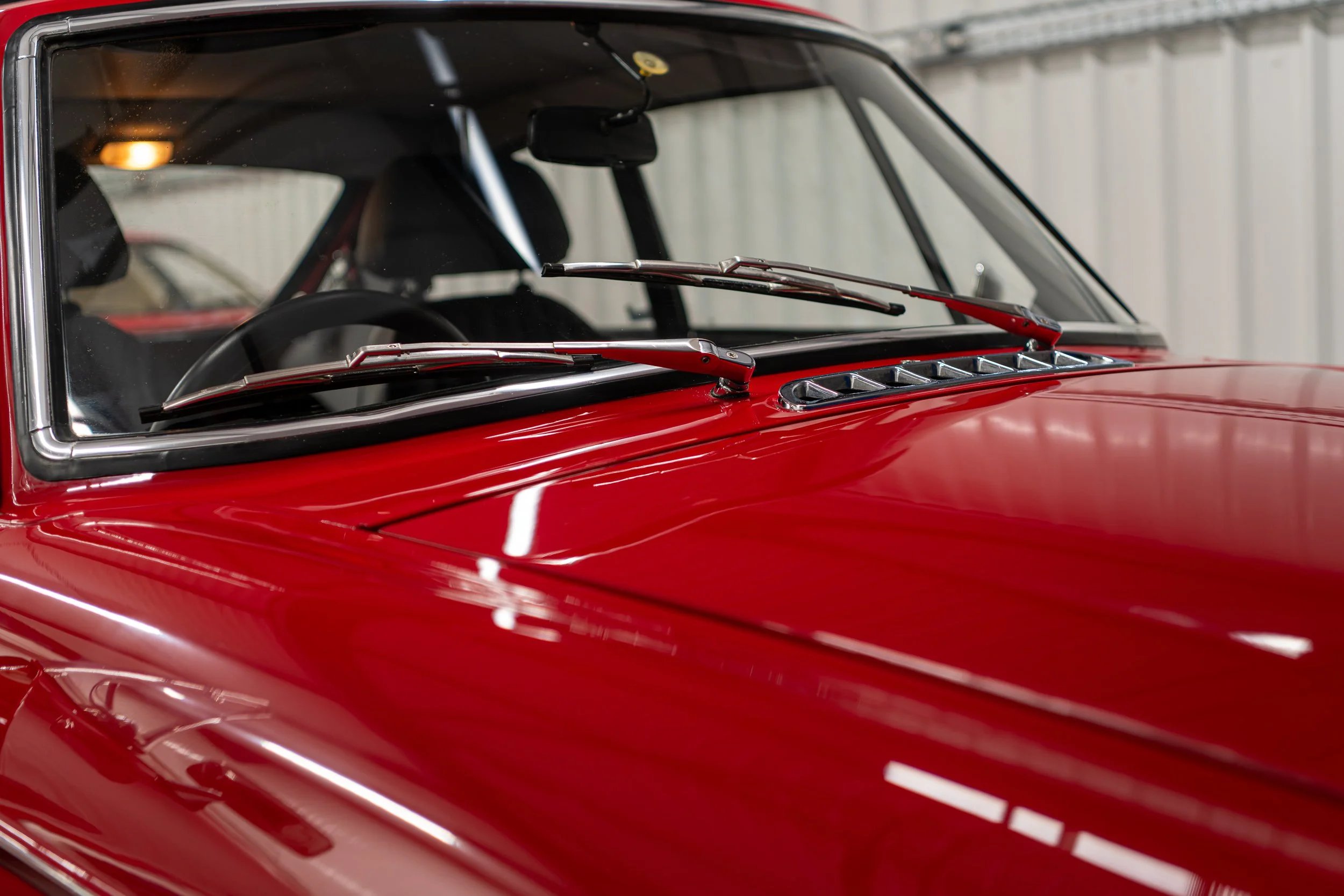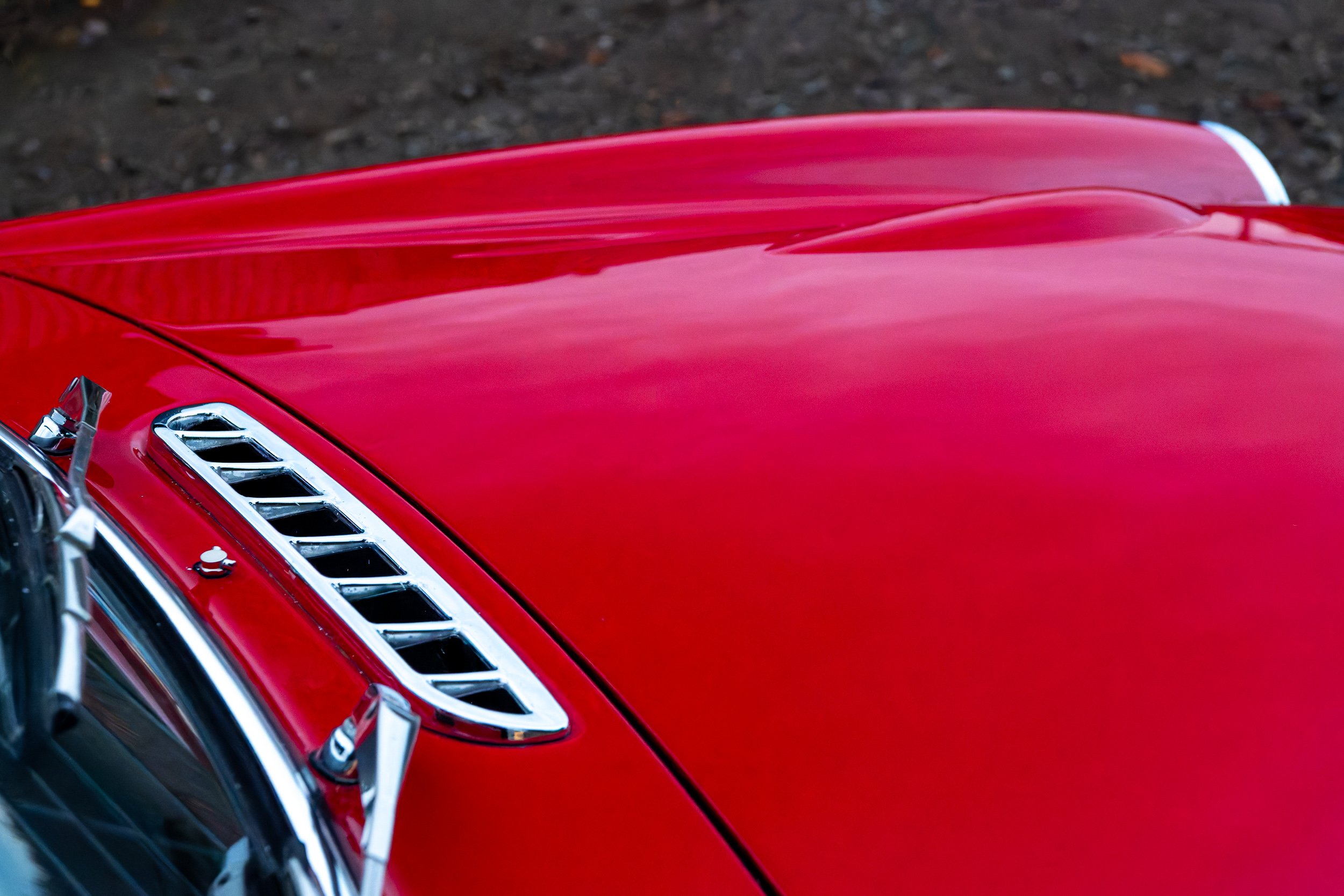Car completely re-shelled during restoration and painted in tartan red. New windscreen. All new bumpers and exterior chrome.